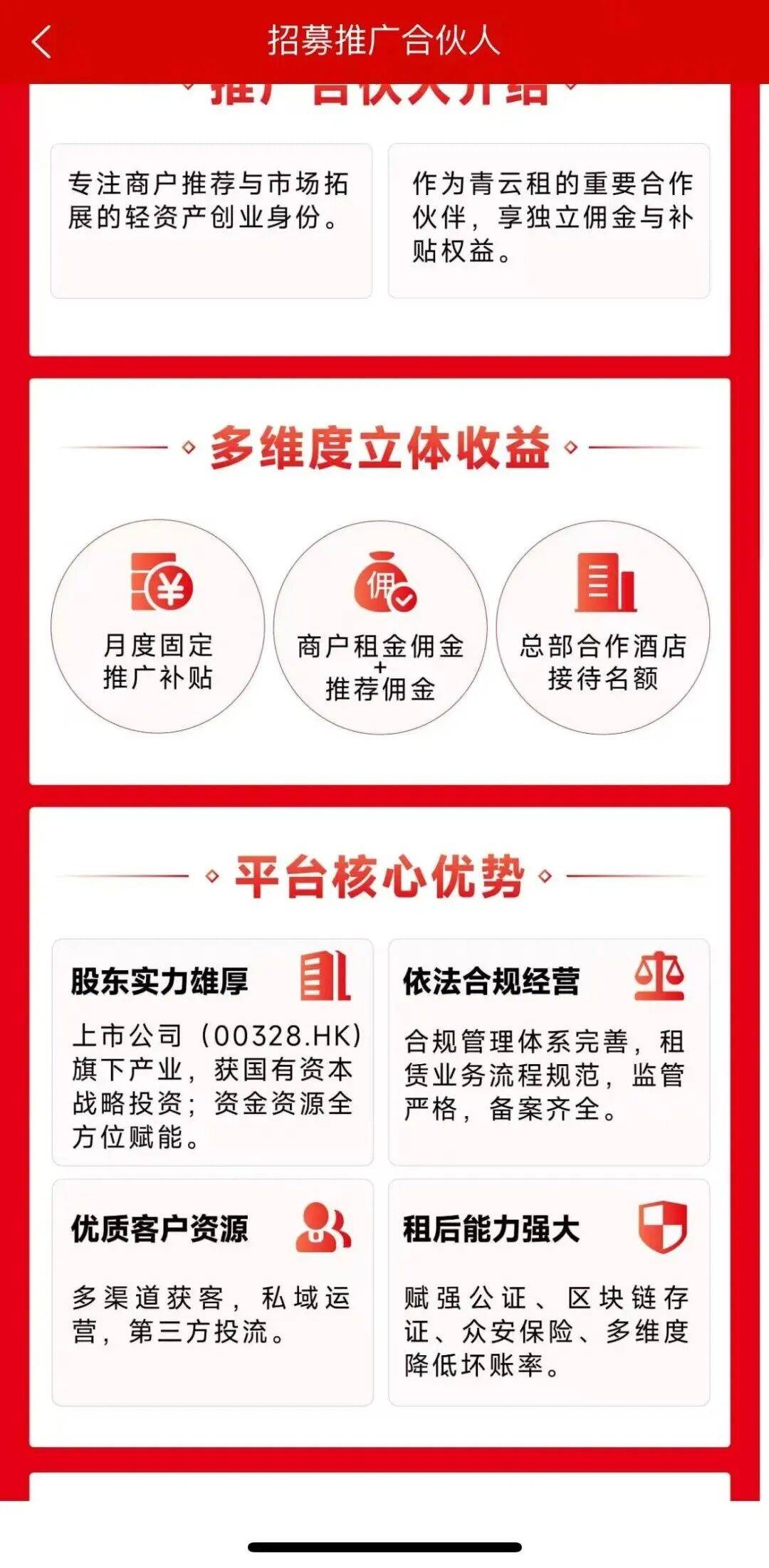 “青云租”一直以来都把自己包装为手机租赁平台的头部,从APP页面到线下投资者招募海报,“青云租”对外宣称自己“固定实力雄厚”,是上市公司旗下产业,业务遍布200多个城市,累计服务用户超过100万人。