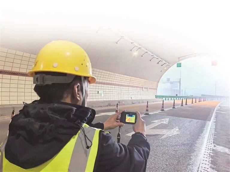举着测温仪测试隧道出口路面,记者清晰地看到,屏幕上显示的橘色高温区域呈条状分布。现场工作人员解释道:“轮胎反复碾压的地方最容易结冰。热管特意集中埋在两排车轮常经过的轮迹带区域,既能快速融化冰雪、提高加热效率,又能避免热量浪费,既实用又节能。”