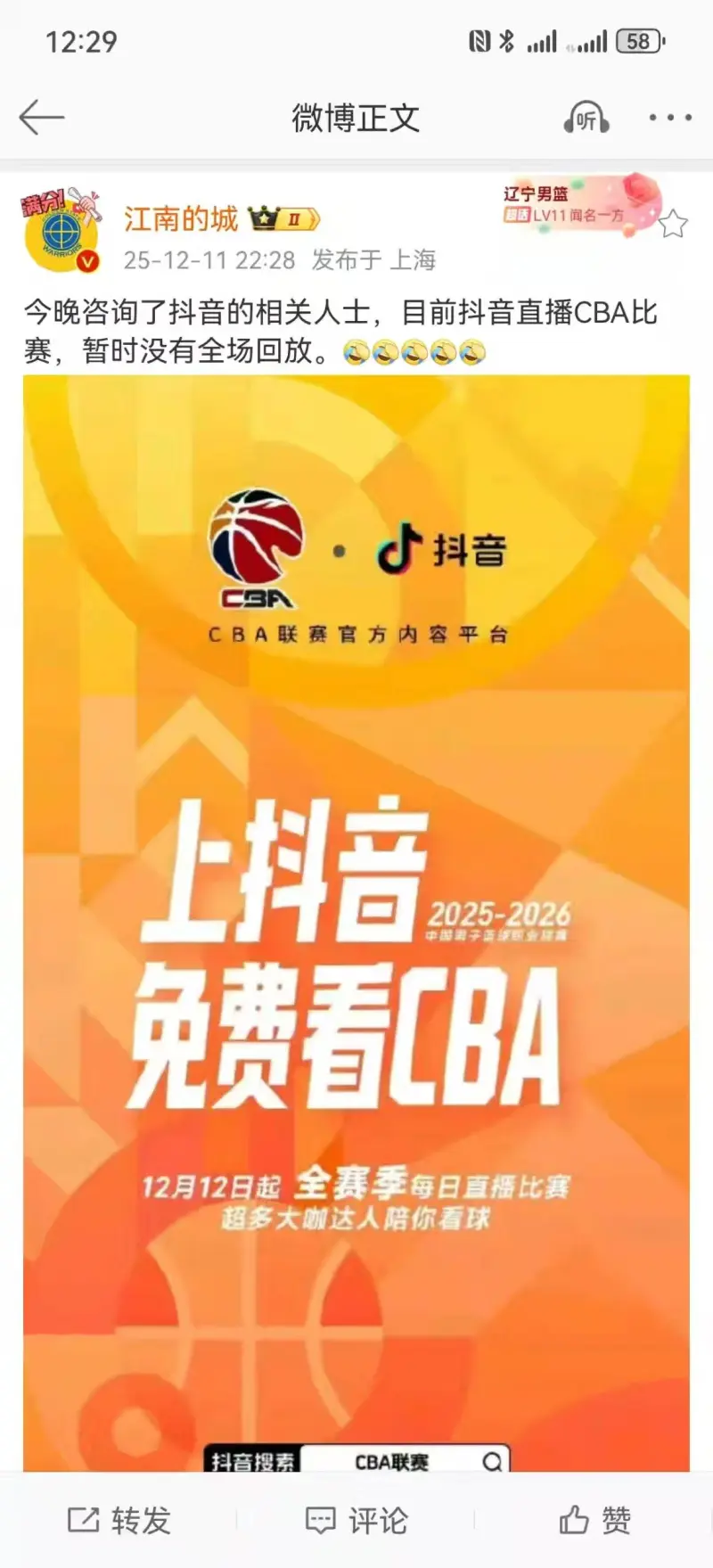 感觉抖音这些很多野球比赛,就是比较官方一点的都有那些回放,只是CBA不想弄而已,你可以在CBA账号上面可以看到那个俱乐部杯上一届的比赛啊,不过要付费就是回放